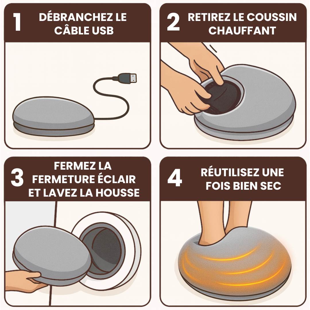 Vous démontez, vous lavez et c’est reparti. La housse douce est facilement lavable, pour un chauffe-pieds toujours propre et agréable, sans complications ni prise de tête.